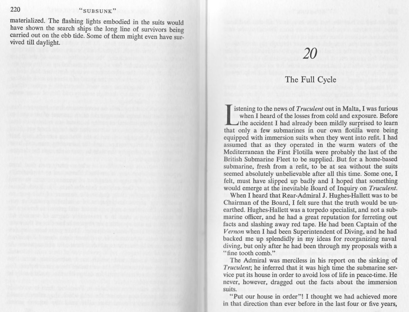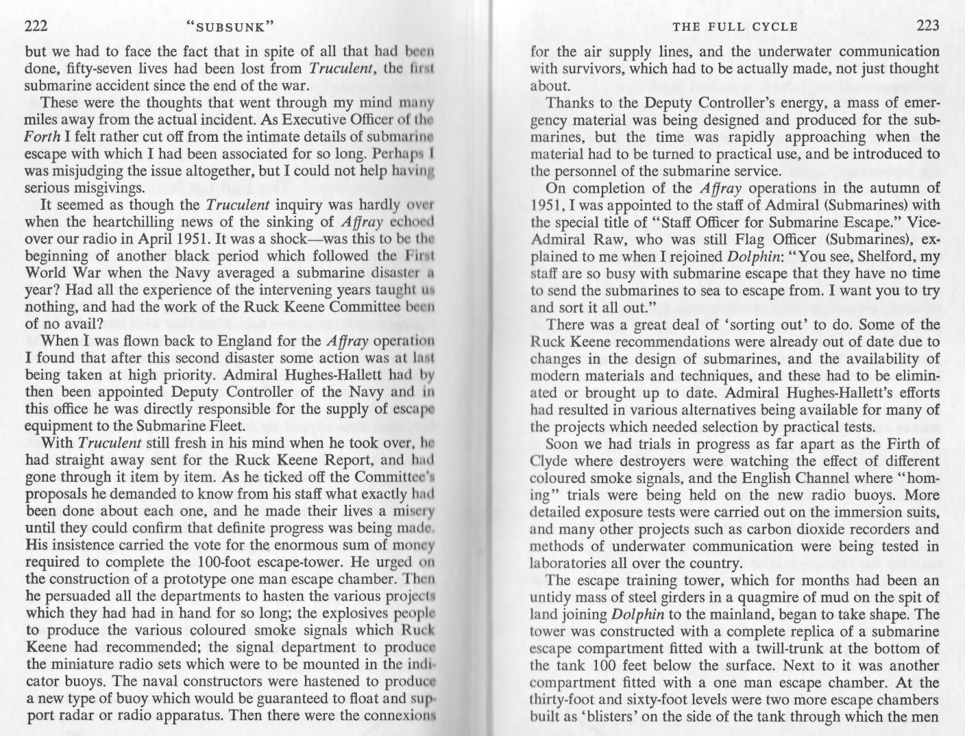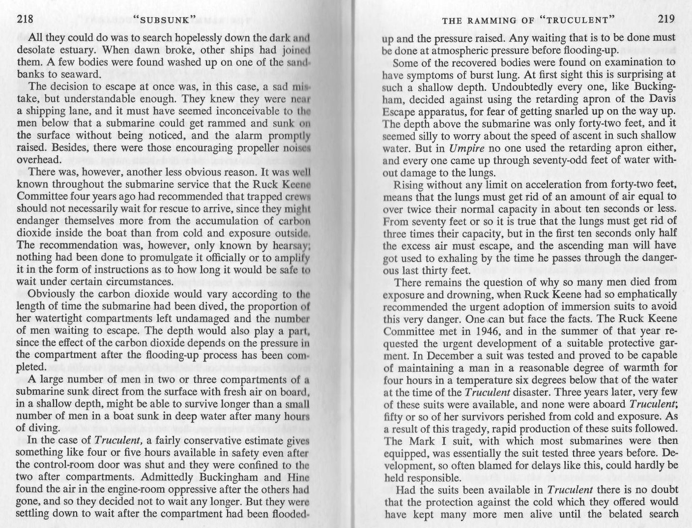 I recommend the reader look carefully at the pages from Subsunk a book by Commander Shelford RN, who had a long career concerned with submarine escape and diving in the Royal Navy. In particualr note how disturbed he was to hear of the loss of the Truculent and the lack of immmmersion suits. (Note Shelfords comments on Page 220).