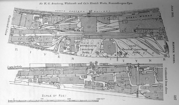 In 1847, engineer William George Armstrong founded the Elswick works at Newcastle, to produce hydraulic machinery, cranes and bridges, soon to be followed by artillery, notably the Armstrong breech-loading gun, which re-equipped the British Army after the Crimean War. In 1882, it merged with the shipbuilding firm of Charles Mitchell to form Armstrong Mitchell & Company and at the time its works extended for over a mile (about 2 km) along the bank of the River Tyne. Armstrong Mitchell merged again with the engineering firm of Joseph Whitworth in 1897. The company expanded into the manufacture of cars and trucks in 1902, and created an "aerial department" in 1913, which became the Armstrong Whitworth Aircraft subsidiary in 1920.