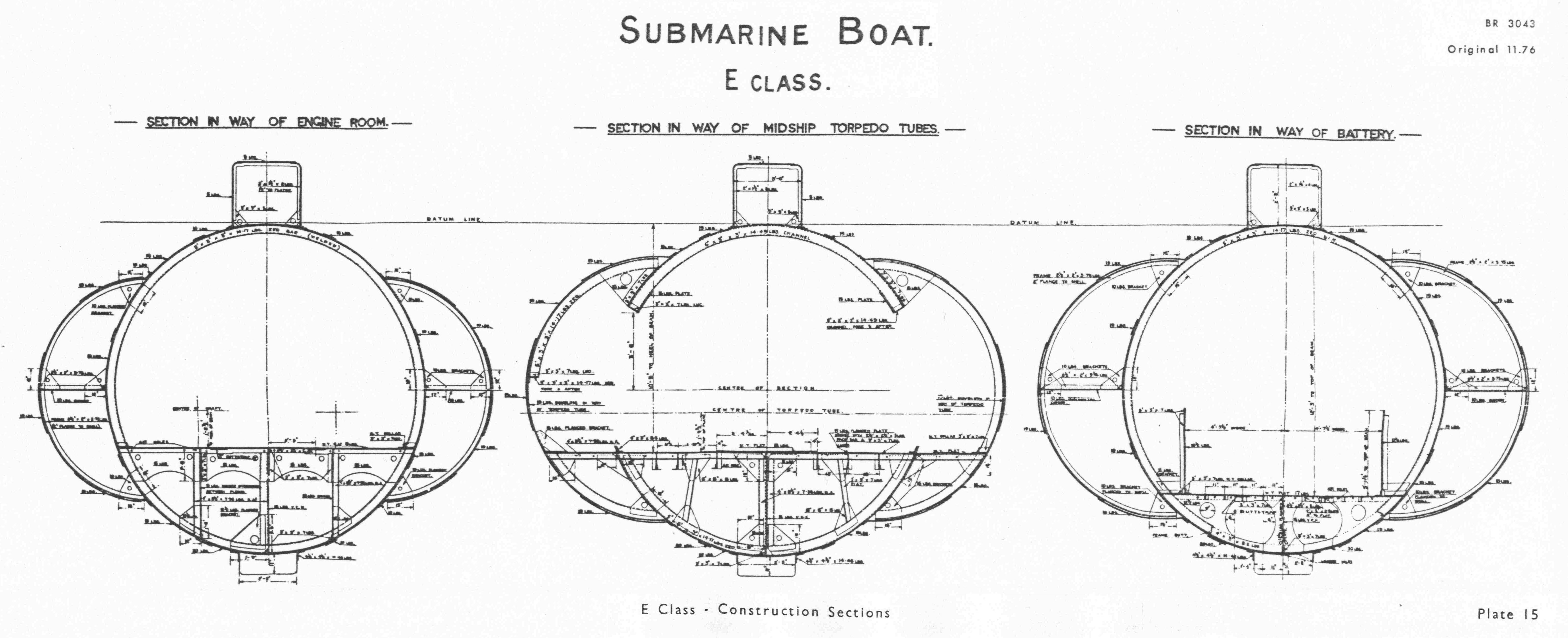 Although internal main ballast tanks were sited under and at the sides of the batteries in the D Class and the plating of the battery tanks remained at 15lb as previously the stiffening was improved. In the E Class in which tanks were kept below the battery tank floor level the watertight flat plating was increased to 17lb and the side plating of the battery tanks decreased to 12½ lb.