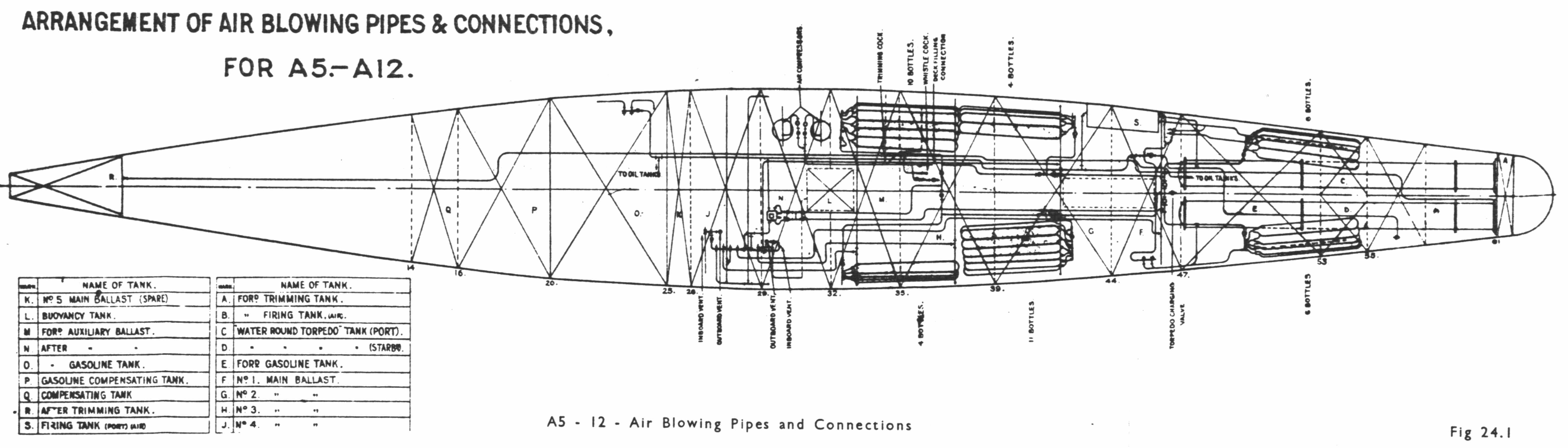 14. Fig 24.1 shows the arrangement of air blowing pipes and connections in A5-12 and the scheme shown applied in principle to the A Class, B Class and C Class. Pipes were led from the air bottles to manifolds with about five or six bottles to each manifold as far as practicable. There was only one valve on each manifold so that if one bottle or its connecting piping leaked all bottles on that manifold were out of use. The manifolds connected to a small ring main. A simple schematic arrangement for A2-4 when originally carrying only 34 bottles is shown in Fig 24.2.