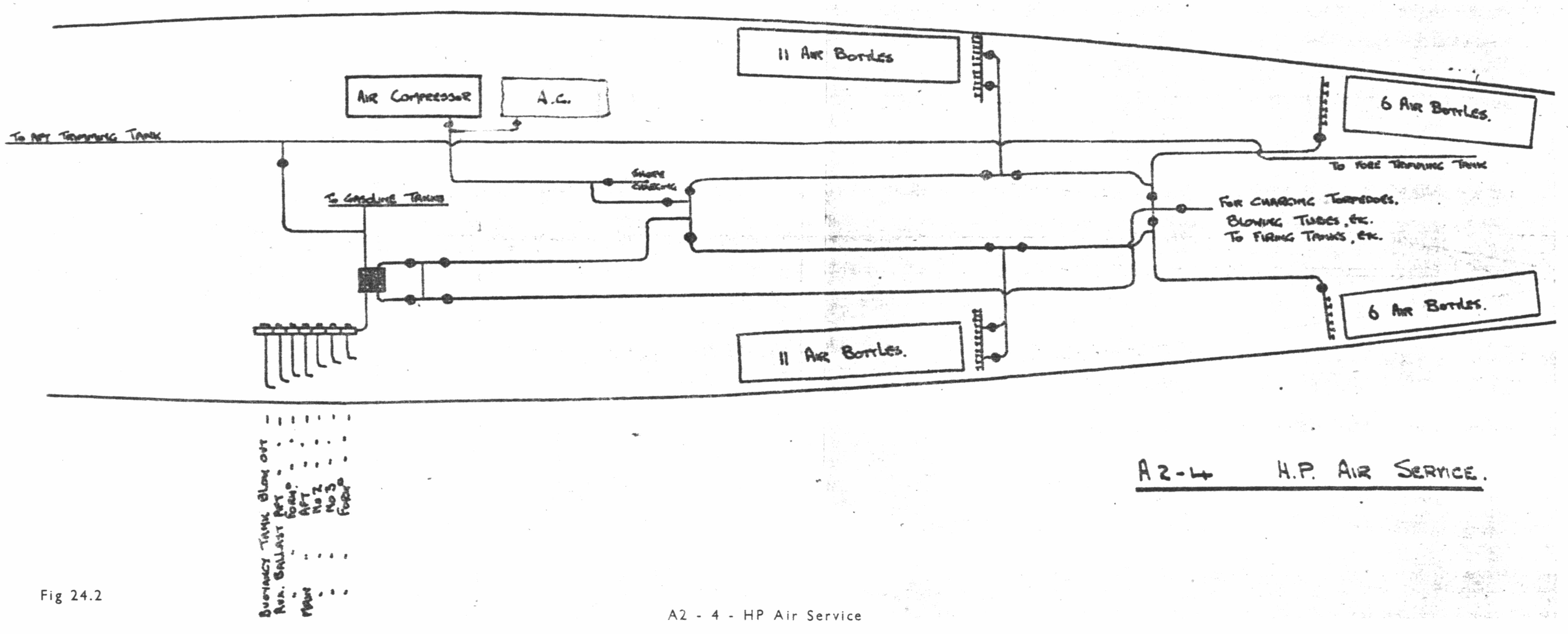 17. From the simple arrangements shown in Fig 24.2 thehp air services obviously increased over the years in size and complexity. As a matter of interest thehp air service in Swordfish (1913) was certainly the most extensive of its time when built and perhaps since.